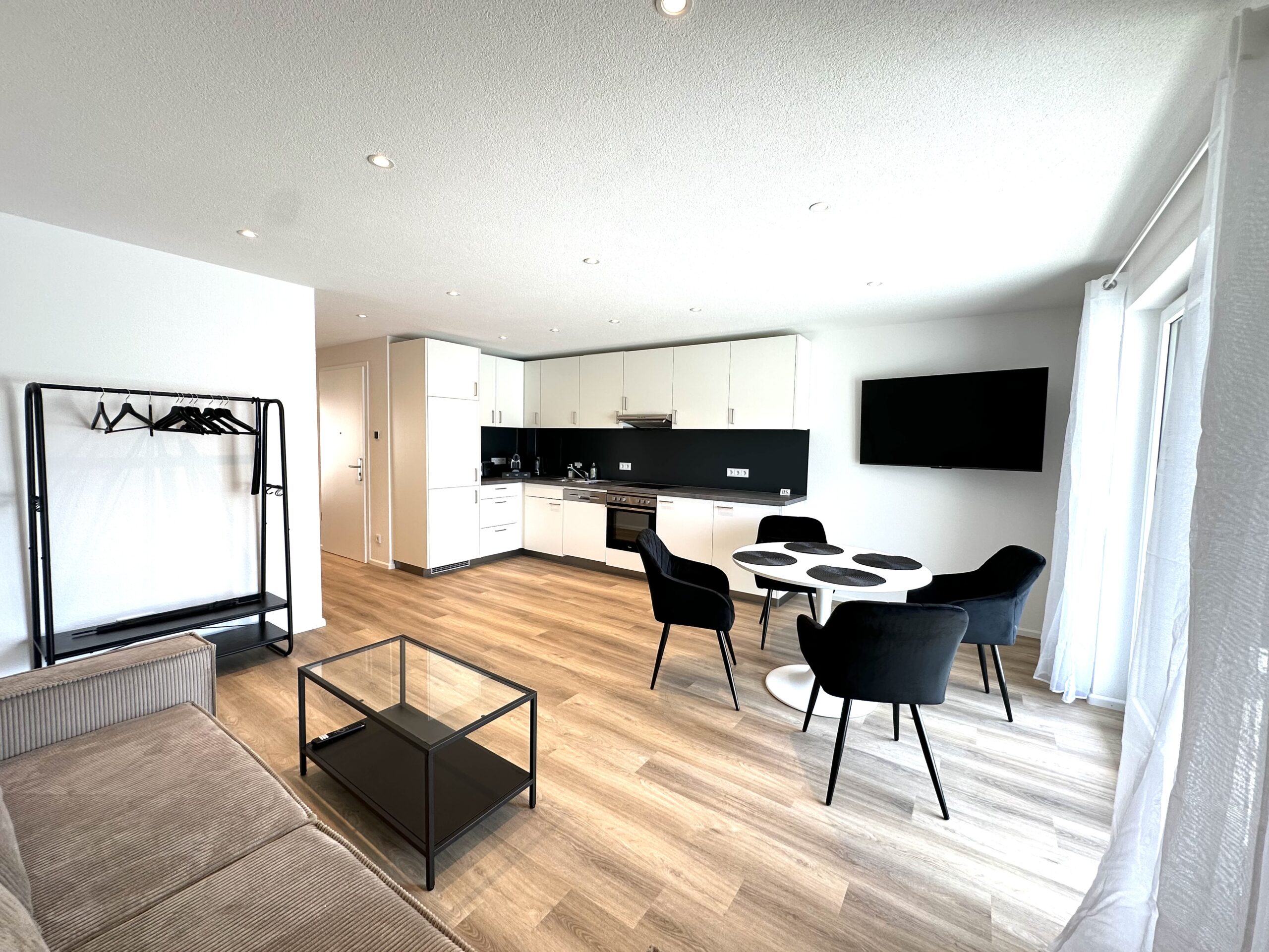 Diese moderne Designerwohnung bietet stilvollen Komfort und ein durchdachtes Raumkonzept – ideal für Geschäftsreisende, Paare oder kleine Familien. Im separaten Schlafzimmer befindet sich ein komfortables Boxspringbett, das erholsamen Schlaf garantiert. Der offene Wohnbereich ist mit einer hochwertigen Schlafcouch ausgestattet – perfekt für einen zusätzlichen Gast oder zum Entspannen. Die voll ausgestattete Küche lädt zum Kochen und Verweilen ein. Im Keller des Hauses stehen eine Waschmaschine und ein Trockner zur gemeinschaftlichen Nutzung bereit – besonders praktisch für längere Aufenthalte.